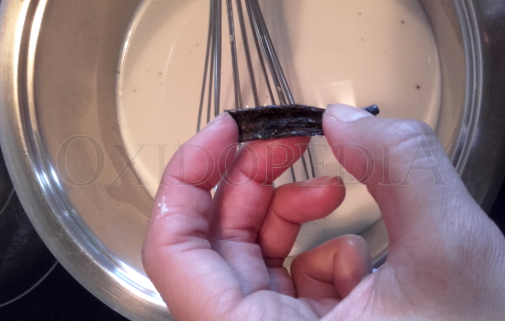Los granitos que hay dentro de la vaina son oro. Ábrela longitudinalmente con un cuchillo, ráspalos y añádelos a la leche. Retira lo que queda de la vaina.