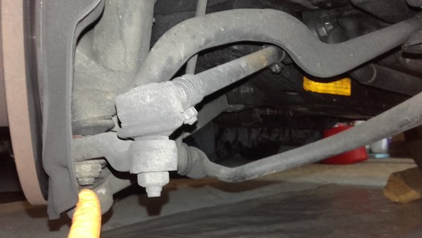 Aunque es un coñazo bastante majo, he sopesado las opciones y yo he optado por desmontar TODO lo que cuelga de la suspensión en su parte inferior: brazo de suspensión transversal, brazo oscilante trasero (el que interesa reparar), anclaje a la mangueta y rótula de dirección. Para la rótula de dirección es necesario un extractor de dos patas rectas. Los tornillos en este caso estaban apretados como los de un submarino, he tenido que tirar de otra de mis «multiherramientas» comúnmente denominada «tubo de metro y medio» acoplada al maneral 🙂 . 8 litros de sudor después…