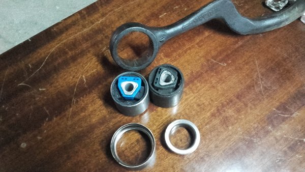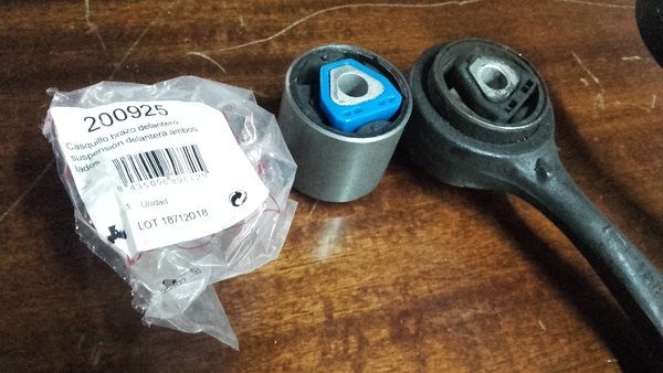 Para solucionar esto hay dos opciones: cambiar los brazos oscilantes completos o cambiar los silentblocks, que se pueden conseguir sueltos. La primera opción no tiene sentido si el brazo no está torcido o si la rótula que va en el otro extremo no tiene holguras. La diferencia de precio entre ambas opciones también es considerable, costando cada siletblock unos 8-15 euros unidad dependiendo de la marca y tienda frente a unos 40-60 euros del brazo completo de competencia… y si se pide original a la BMW tengo el recuerdo de que costaba como unos 120 eurazos CADA UNO, vamos, un dolor de hígado y cartera. Obviamente he optado por la opción 1 🙂 .