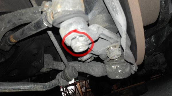 La teoría está muy bien hasta que cuando vayáis a intentar sacar la rótula os deis cuenta de que no hay sitio físico para meter un extractor de rótulas y en caso de querer hacerlo habría que desmontar la pinza de freno, el disco y su protector de chapa. En este punto empezaréis a acordaros de toda la familia del ingeniero que decidió hacerlo así 🙂 . He probado método alternativo, pinzando la rótula con un taco largo de madera por debajo de la rótula apoyando en plano sobre la tuerca y a martillazo limpio en el lateral del soporte (para que con la vibración se suelte la parte cónica de la rótula) pero no había forma, estaba agarradísimo y no saltaba del sitio.