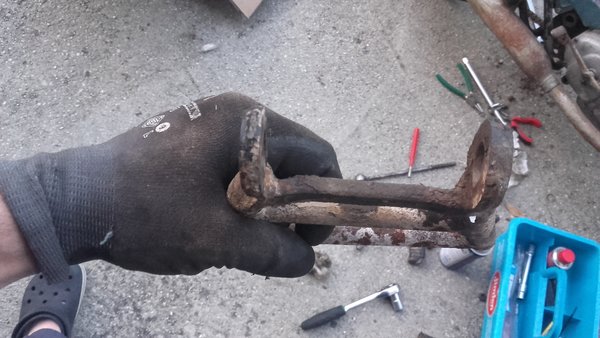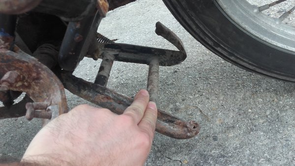 El caballete no hay por donde cogerlo, una de las puntas de las patas ya no existe y la otra se ha vuelto tímida por colisión 🙂 . Ya tengo en mente como arreglarlo con redondo de acero, curvadora y soldadura, no debería dar mucha guerra. A esta moto le han montado una pata de cabra lateral que, aunque bastante práctica en el día a día, posiblemente extermine porque estorba para desmontar el eje del pedal de freno y mantenerla requiere soldarla al chasis… no es muy operativo para mantener la moto a posteriori.