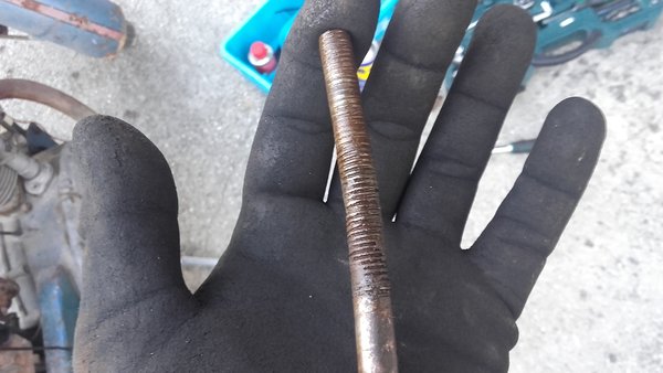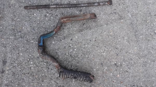 Después de sacar tuercas, tornillos amarrados a muerte y tal… normal que los pedales estuviesen torcidos…. menuda curva tiene el soporte que va al bastidor, así quedó el tornillo que tuve que desclavar a martillazo limpio y encima la rosca está pasadísima en toda su extensión (le habían calzado 3 señoras tuercas, una delante de la otra), voy a necesitar uno nuevo.