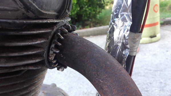 La tuerca del escape como me imaginaba tenía pinta de estar amarrada a la culata como si se hubiesen fundido entre ellas allá por el 58. Me compré un útil específico la mar de majo para aflojar la tuerca pero… pobre iluso, está tan amarrada que el útil (que tampoco es que sea de mantequilla) se dobla hasta que saltan los dientes de su posición de anclaje 🙁 . A eso hay que sumarle lo maltrechas que están las patillas de la tuerca; algunas las he enderezado y otras o ya estaban rotas o se me han roto al intentar enderezarlas. También he probado a darle calor con el soplete, darle cariños con el martillo y un cincel… da igual, no se mueve NADA. Pues bueno, como el codo está doblado y no lo voy a aprovechar, de momento para poder sacar el motor he aplicado la solución de «cuando algo se tuerce en el taller»… RADIAAAAAAL!!!! 🙂 . Esa tuerca va a costar sangre y sudor para sacarla de la culata 🙁 .