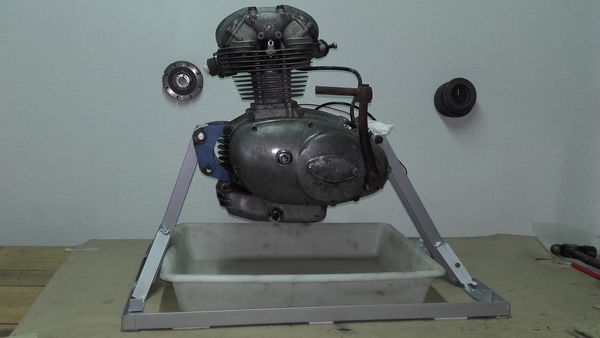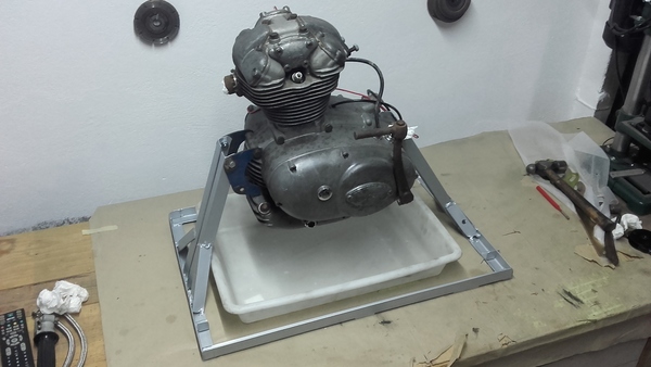 Para trabajar cómodo sobre el banco del taller, hasta que abra los cárteres por la mitad me he fabricado una bancada de taller para el motor con unos hierros viejos que tenía tirados por el taller. Chavales!! como dicen en mi tierra…»el que guarda siempre tiene!!«, hay que reciclar 😀 . Le he dejado hueco suficiente para poner debajo la bandeja de recogida de aceite, así ya puede chorrear lo que quiera 🙂 .