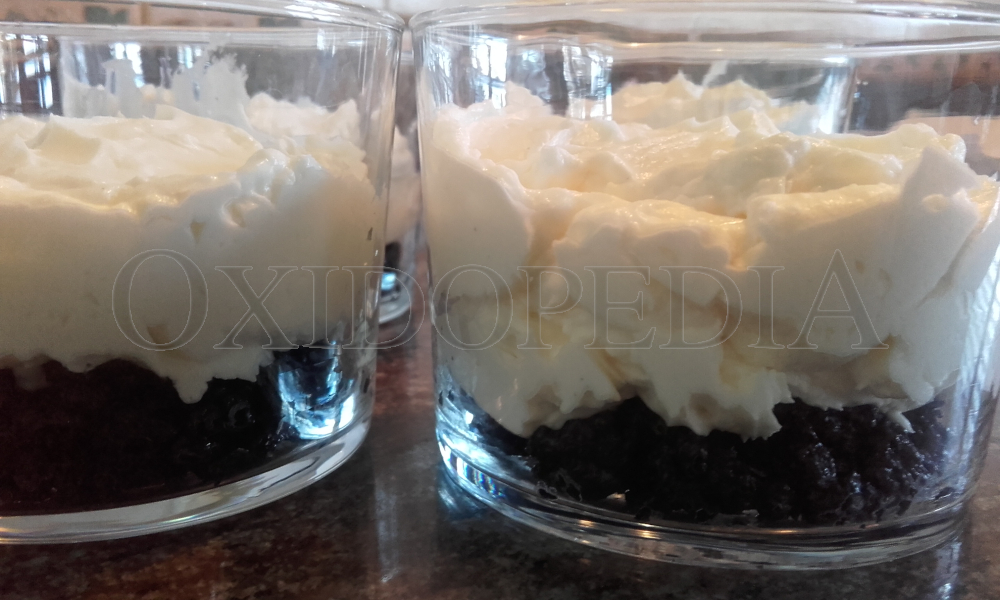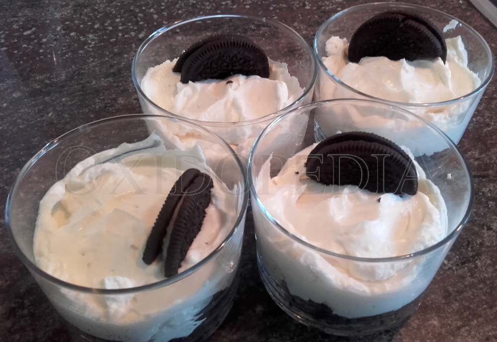 Ponemos la crema en los vasitos sobre la base de galleta. Adornamos con medias oreo y… ¡a la nevera! O a comer, porque realmente esta tarta no necesita reposo 😉